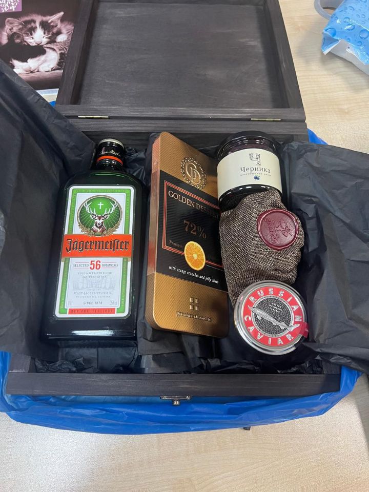 "черное золото": надежный фирменный деревянный подарочный ящик с черным шоколадом, черничным джемом, черной икрой, черным чаем и черной-черной настойкой. Воплотили: